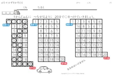 | 右端の車のナンバーを考えよう 少し難しいときはグループでやって下さい。でき始めると楽しくできます。 数字を楽しく書くことが目的なので楽しくできればいいと思います。上の行の右端に例を上げています。 |