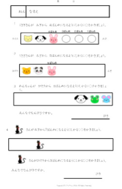 | 10はいくつといくつ | 5から9 いくつといくつ | なんばんめ | 〇と〇で10 | たし算パズル | たすかずをもとめる | ||||