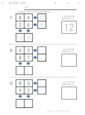 | a3-29は 数を指定して,その数に合う 式を つくるプリントです。先生が 数を決めたり,数の範囲は決めておいて,グループで 数を決め 式を 見つけていくと良いと思います。 「〇をかいて」のところを先にしてから式を考えた方がいいと思います。できる速さが 違うので 最後に絵をかくことで時間調整します。 | |||||||||
