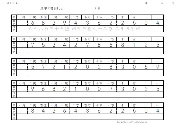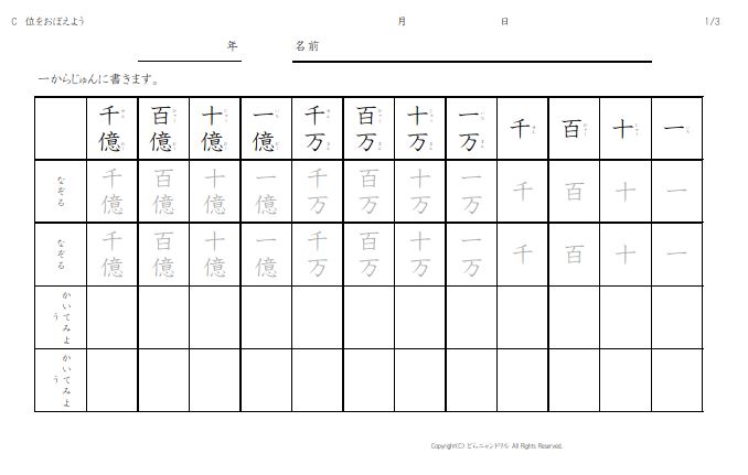 | 位をおぼえよう | 一億をこえる数 | 大きな数の数直線 | 漢数字を数字で書く練習 2年の復習 |