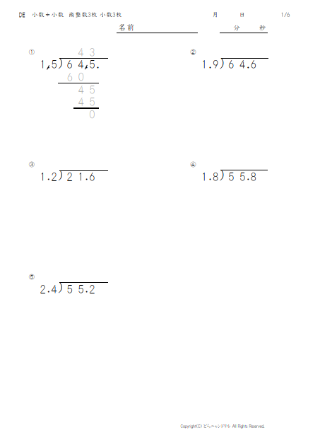 | 整数÷小数1桁あまりなし | 3桁÷2桁あまりなし | あまりなし | 3桁÷2桁 小数÷小数 あまりなし |