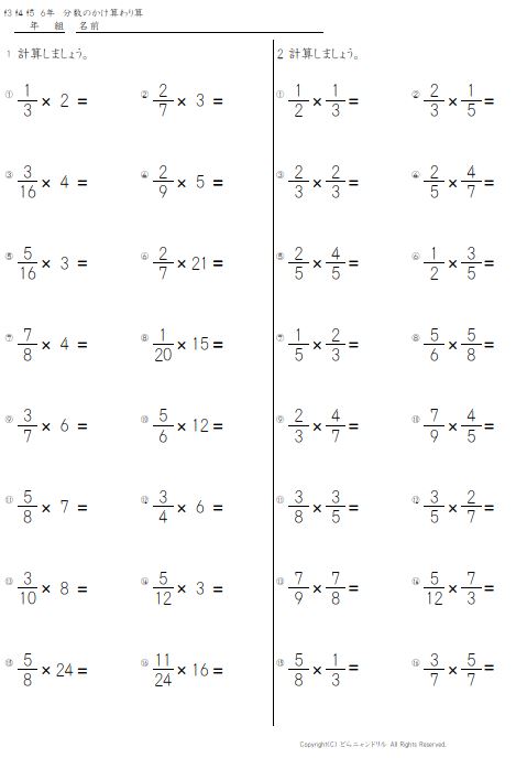 | かけ算わり算まとめ | 分数×分数 | 分数×分数 | 真分数×帯分数 | 約分の練習 | 帯分数×帯分数 |