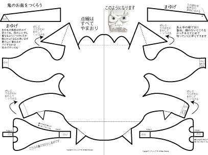 赤や青の色画用紙でつくってみてね お面にするときは左右の耳の部分に穴をあけて輪ゴムとか紐を通して頭の後ろへかけるようにします |