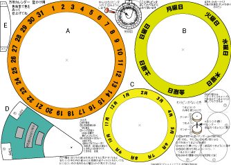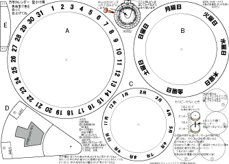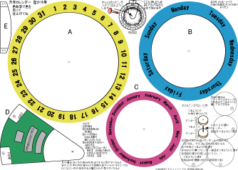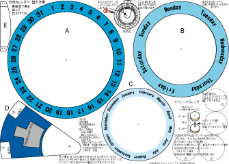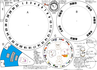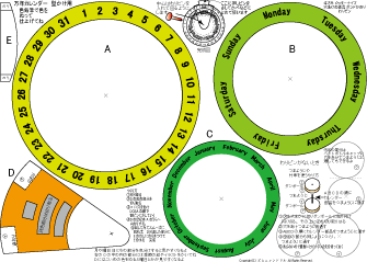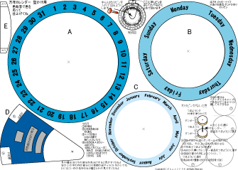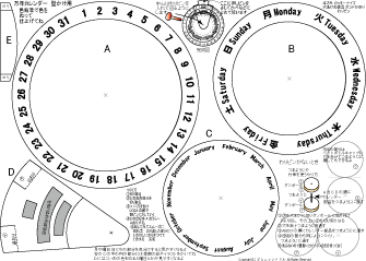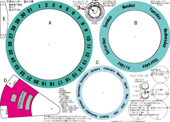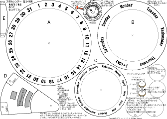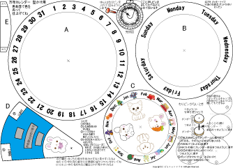 万年カレンダーかべかけ用 簡単 低学年でもできます 2025.7.28更新 A4厚紙に印刷 ハサミ のり 色鉛筆 わりピン(なければ つまようじ か 竹串) |