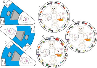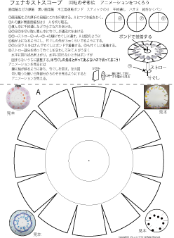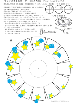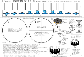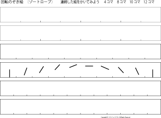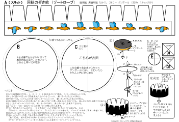 低学年向きの87-2はスリットを斜めにして切りやすくしています。 ゾートロープ フェナキストスコープで検索すると,たくさんの回し絵があります。参考にしてつくってみてね。フェナキストスコープの方が絵をかく面が広いのでいろんなアニメーションの変化が楽しめますが,鏡に映して見るのでつくったその場でアニメーションを見ることはできません。 | |||||