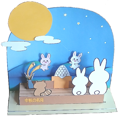 縁側でお月見 山をはるときに背景と山の間に縦5㎜横13㎝のダンボールを間に入れるとより立体的になります やってみてね | |||||