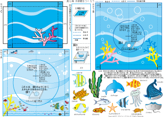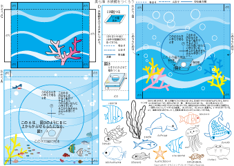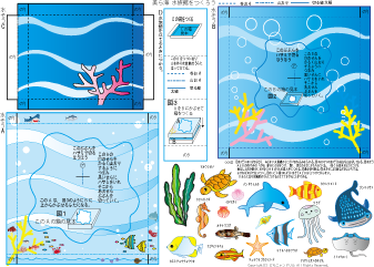 この4つは3つの箱を3段にして奥行を出しています。 窓部分はカッターナイフを使わずにハサミでも切ることができます。 箱の形にしていくのが難しい時は 49-14 を使ってみてください。子どもの力に合わせてつくってください。 ずかんで調べていろんな海の生き物をかいて世界に1つしかない水族館をつくりましょう。 |