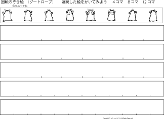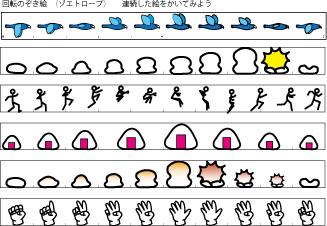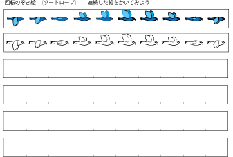 3 回転のぞき絵 ゾートロープ アニメーションをつくろう A4厚紙に印刷 ハサミ のり ボンド 竹串 ストロー ダンボール 黒画用紙 色鉛筆 |