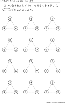 | 3つの数をたす問題です | 暗算の力をつけます | 合わせて10~19になる数を3つか4つの数の中から見つけます | 2つずつから10ずつまでかこんでいきます かけ算の基礎です |