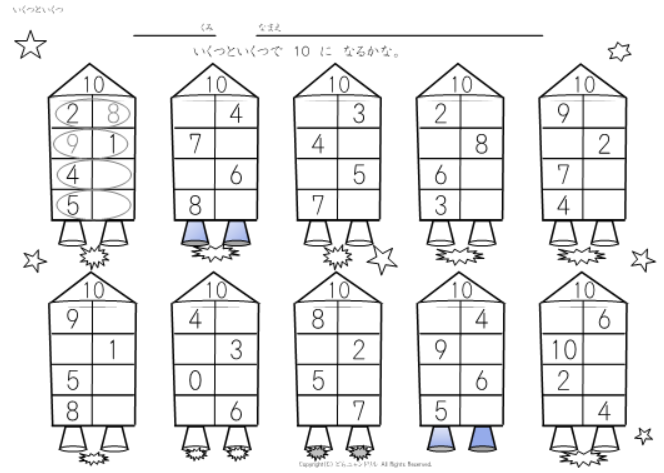 星の数を見てぱっと数を答えます | 点をつないで図形をかいていきます | 合わせて10になる数を見つけて○でかこんでいきます 20まであります |
